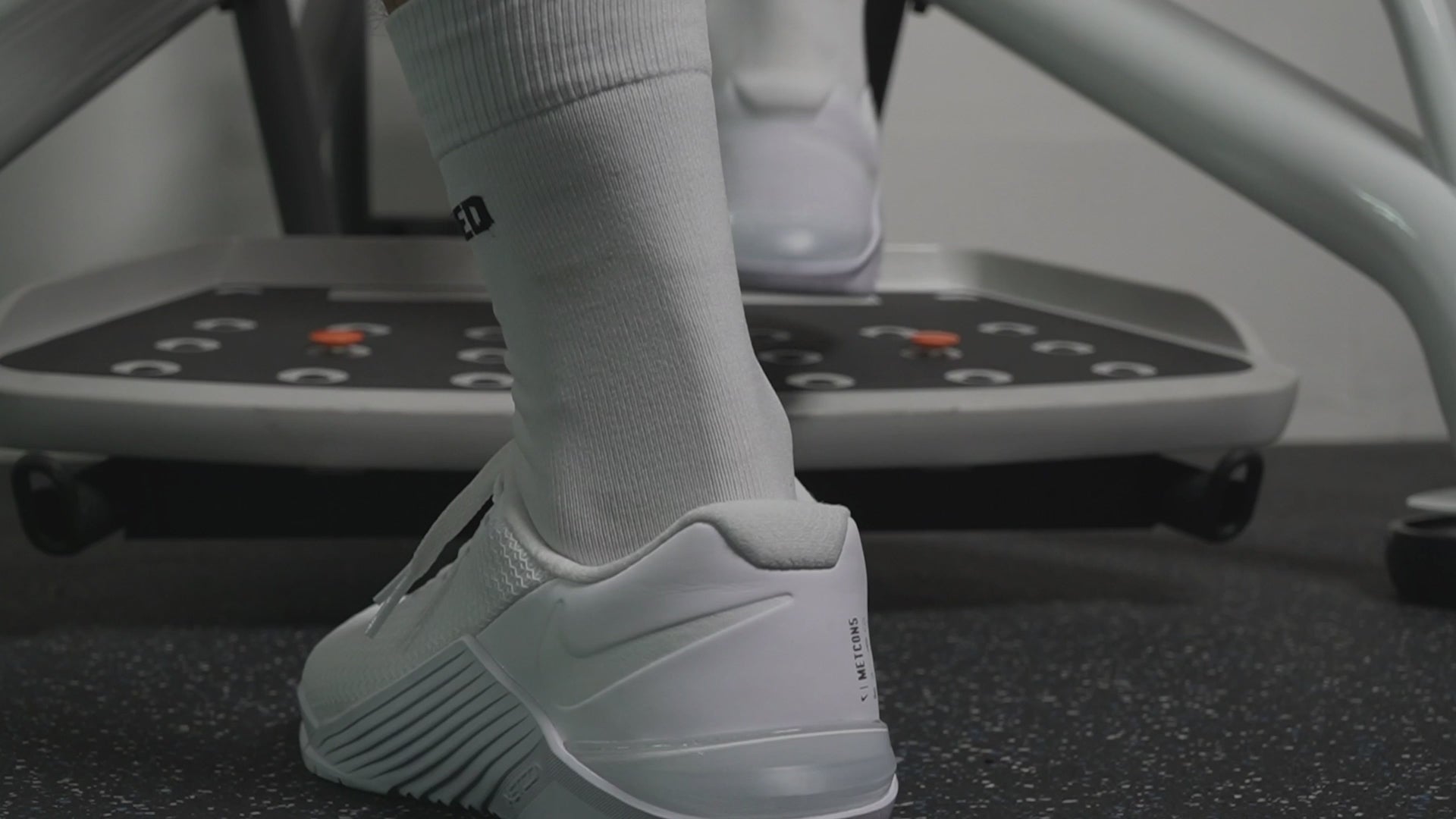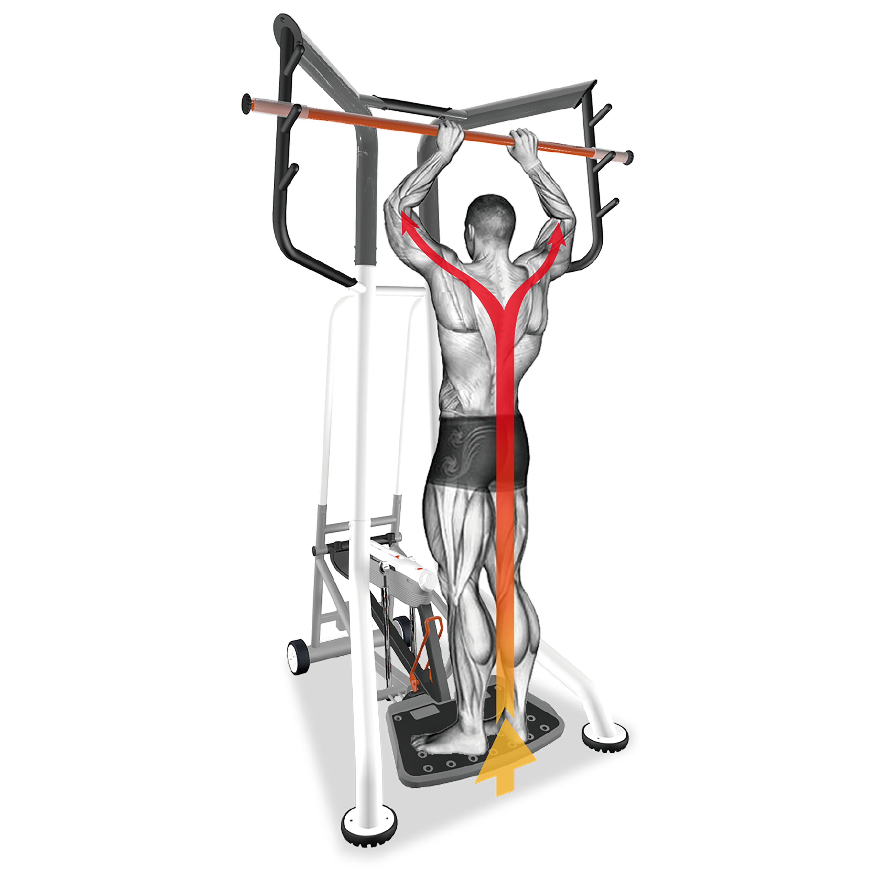 達文西足跟控制錨點 (平台上的兩個橘色按鈕) 可確保您維持棒式姿勢. 只有當雙腳腳跟同時踩在兩個錨點上時, 才能開始引體動作.